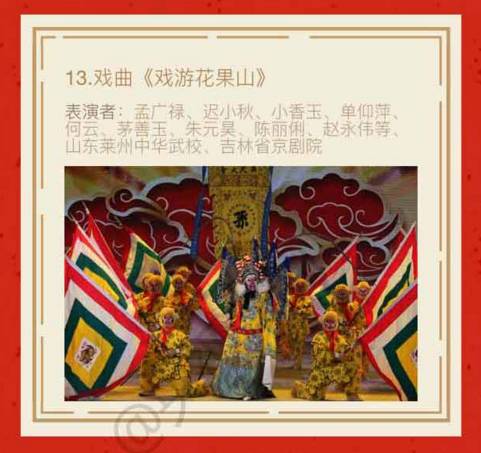 值得一提的是,之前呼声最高的六小龄童并未出现在春晚节目单中,取而代之的是戏曲《戏游花果山》。