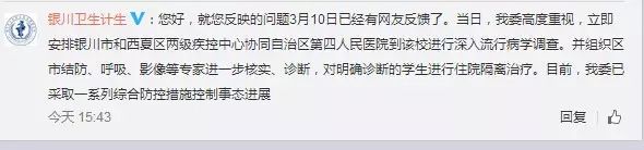 15时43分,@银川卫生计生 对该微博作出官方回复:“您好,就您反映的问题3月10日已经有网友反馈了。当日,我委高度重视,立即安排银川市和西夏区两级疾控中心协同自治区第四人民医院到该校进行深入流行病学调查。并组织区市结防、呼吸、影像等专家进一步核实、诊断,对明确诊断的学生进行住院隔离治疗。目前,我委已采取一系列综合防控措施控制事态进展。”