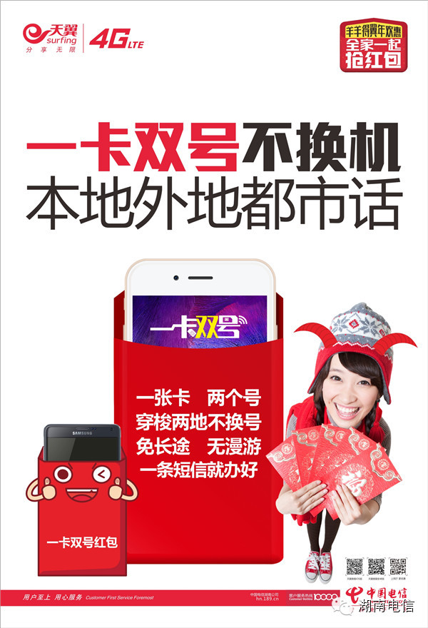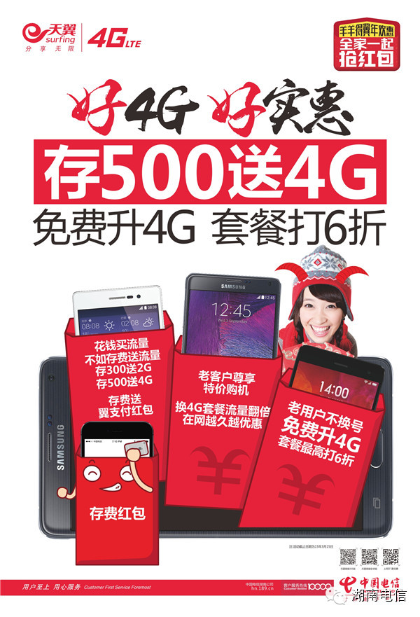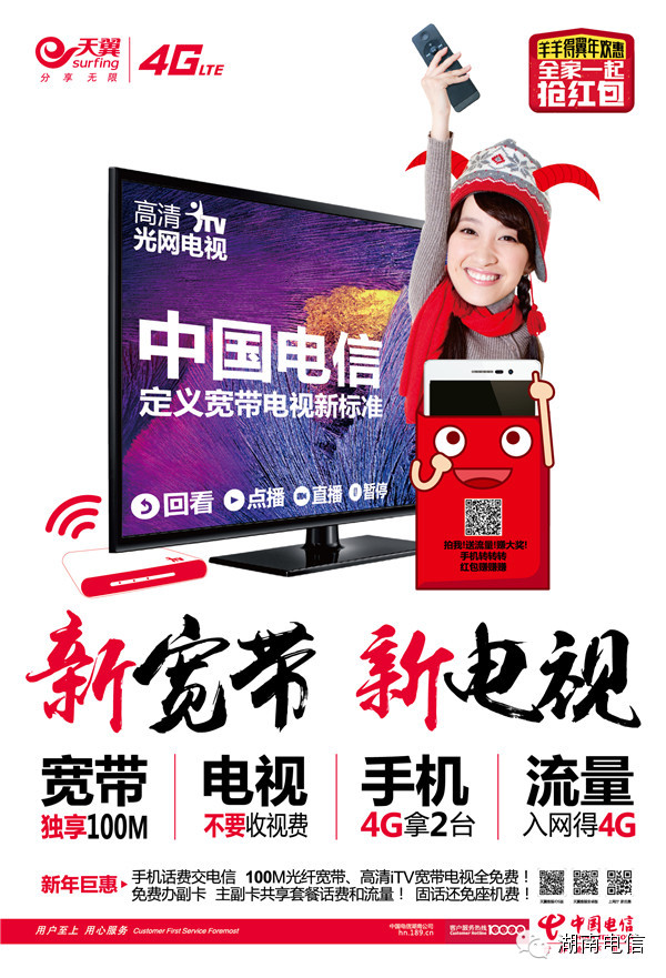 大会隆重推出了“羊羊得翼年欢惠”促销政策,湖南电信准备了亿万红包与客户同贺羊年。针对“新宽带 新电视”以及“好4G 好实惠”推出了包括宽带电视双机红包(宽带电视全免费)、存费红包(存500送4G)、好4G好实惠(百款千元大屏手机)、一卡双号红包等超级优惠,新年红翻天!还有手机流量红包放肆转,放肆赚!