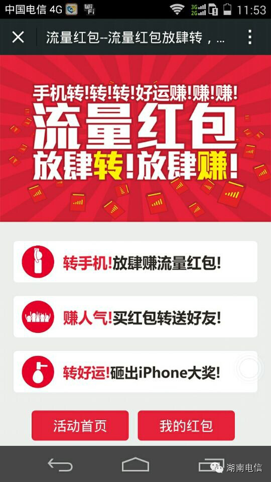 手机转转转,流量赚赚赚!点击阅读原文,所有电信用户即可马上参与活动,流量红包放肆转,放肆赚!