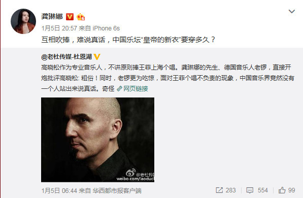 此前,龚琳娜通过微博对王菲走音提出了批评,龚琳娜先生老锣以《明星会过气,艺术会永存》的文章,批王菲不再是努力的歌声。高晓松站出来力挺王菲,老锣直接开炮批评高晓松: “粗俗!”于是1月5日晚,龚琳娜通过微博炮轰高晓松,写道:“互相吹捧,难说真话,中国乐坛‘皇帝的新衣’要穿多久?”